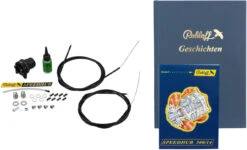 Contenu du sachet de petites pièces : 2 x écrous hexagonaux M10x1, 2 x rondelles pour axe TS, 8 x ferrules, 1 x bague entretoise 6,5x10x5,5 pour contre-plaque, 1 x contre-plaque 13° avec vis de réglage de câble, 1 x collier de serrage pour support de couple, 5 x entretoises pour plateau, 2 x fermetures baïonette, 2 x vis M8x0,75, 2 x douilles filetées M8x0,75, 2 x rondelles, 1 x tuyau de remplissage